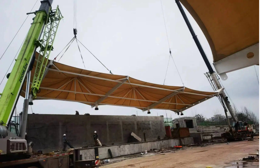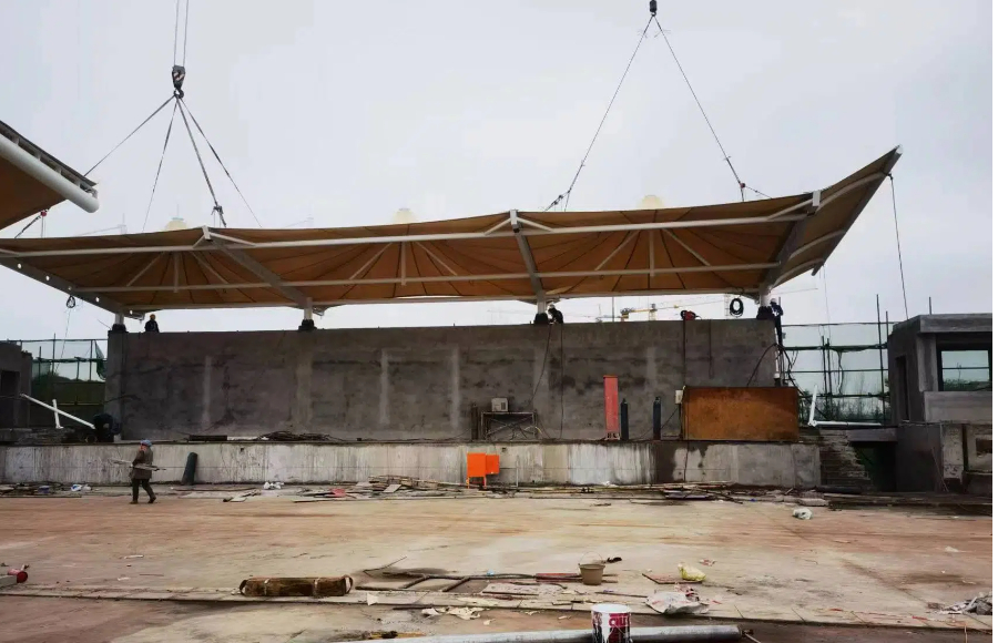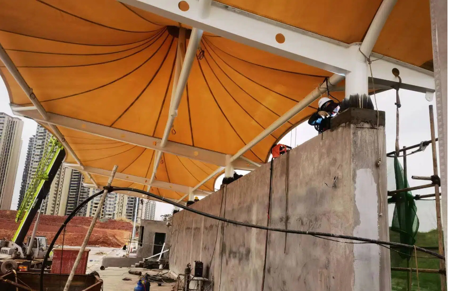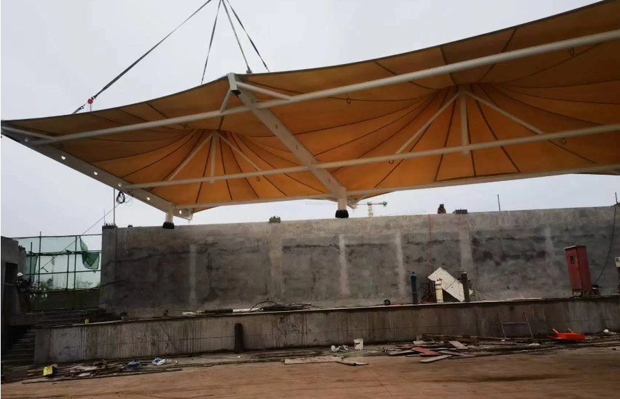 綿陽育才中學莫結(jié)果看臺工程正在施工中,看臺設(shè)計為單邊懸挑張拉結(jié)構(gòu),選用黃色膜材。